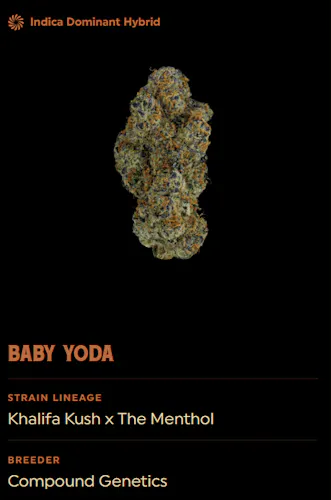 Baby Yoda is a visually stunning strain, featuring a bright green hue with subtle purple undertones accented with fine orange hairs, and a heavily frosted appearance that hints at its potency. Its dense kush structure is both eye-catching and indicative of its quality. On the nose, Baby Yoda delights with a lemon candy aroma reminiscent of Lemonheads, balanced by a refreshing menthol note on the backend. The flavor follows suit, delivering a sharp cooling menthol taste that invigorates the palate similar to a Newport. Effects-wise, Baby Yoda induces a spacey, euphoric, and uplifting high, perfect for those seeking a galactic escape.