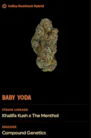 Baby Yoda is a visually stunning strain, featuring a bright green hue with subtle purple undertones accented with fine orange hairs, and a heavily frosted appearance that hints at its potency. Its dense kush structure is both eye-catching and indicative of its quality. On the nose, Baby Yoda delights with a lemon candy aroma reminiscent of Lemonheads, balanced by a refreshing menthol note on the backend. The flavor follows suit, delivering a sharp cooling menthol taste that invigorates the palate similar to a Newport. Effects-wise, Baby Yoda induces a spacey, euphoric, and uplifting high, perfect for those seeking a galactic escape.