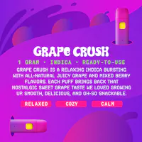 Grape Crush is a relaxing indica bursting with all-natural juicy grape and mixed berry flavors. Each puff brings back that nostalgic sweet grape taste we loved growing up. Smooth, delicious, and oh-so snackable. SNACKBAR™ vapes bring you bold fruit flavors and super juicy puffs, powered by Clean Heat™ Ceramic Technology for a pure, metal + cotton free experience. Enjoy smooth, consistent hits without off flavors—just crave-worthy clouds every time. » TRY RISK FREE — 100% Happiness Guaranteed! » SUPPORT LOCAL! — Chicago-based Independent Founder » WOMAN-OWNED — Made by a Woman-Owned Business LET'S GET SNACKY! snackbarvape.com | @snackbarvape